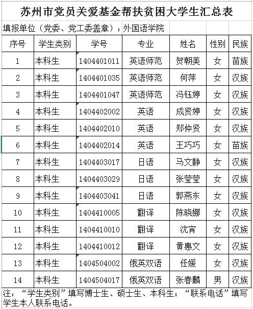 2014年澳门赌场 苏州市党员关爱基金帮扶贫困大学生汇总表