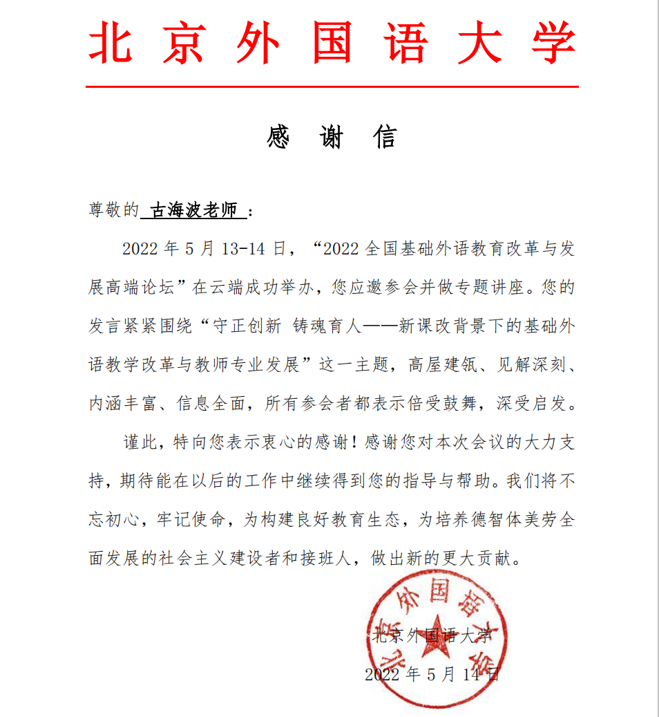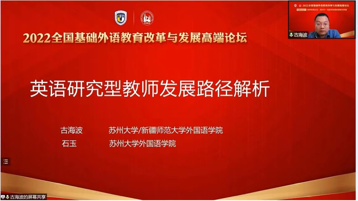 2022年5月13日,由北京外国语大学主办、外语教学与研究出版社承办的“2022全国基础外语教育改革与发展高端论坛”开幕。13日下午,澳门赌场 古海波副教授 (新疆师范大学澳门赌场 挂职副院长)和21级研究生石玉受邀参加分论坛六:“新时代一线教师发展的困境与突破”,并发表题为“英语研究型教师发展路径解析”的学术报告。论坛全程线上直播,吸引了约1.87万人次观看。北京外国语大学为此发来感谢信。